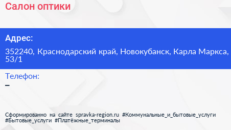 Салон оптики по адресу 352240, Краснодарский край, Новокубанск, Карла Маркса, 53/1 в дальнейшем Организация, размещена в следующих категориях: