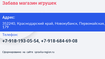 Забава, магазин игрушек по адресу 352240, Краснодарский край, Новокубанск, Первомайская, 179 в дальнейшем Организация, размещена в следующих категориях: