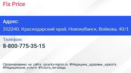 Fix Price по адресу 352240, Краснодарский край, Новокубанск, Войкова, 40/1 в дальнейшем Организация, размещена в следующих категориях: