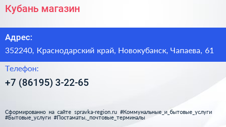 Кубань, магазин по адресу 352240, Краснодарский край, Новокубанск, Чапаева, 61 в дальнейшем Организация, размещена в следующих категориях: