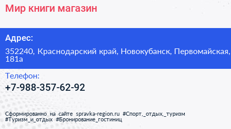 Мир книги, магазин по адресу 352240, Краснодарский край, Новокубанск, Первомайская, 181а в дальнейшем Организация, размещена в следующих категориях:
