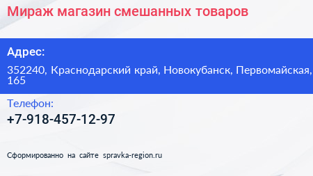 Мираж, магазин смешанных товаров по адресу 352240, Краснодарский край, Новокубанск, Первомайская, 165 в дальнейшем Организация, размещена в следующих категориях: