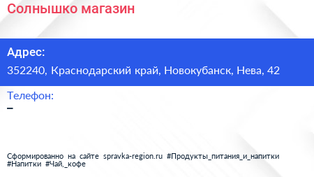 Солнышко, магазин по адресу 352240, Краснодарский край, Новокубанск, Нева, 42 в дальнейшем Организация, размещена в следующих категориях: