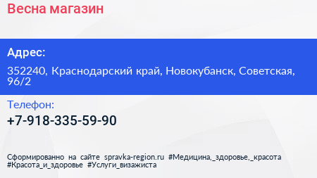 Весна, магазин по адресу 352240, Краснодарский край, Новокубанск, Советская, 96/2 в дальнейшем Организация, размещена в следующих категориях: