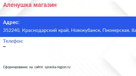 Аленушка, магазин по адресу 352240, Краснодарский край, Новокубанск, Пионерская, 8а в дальнейшем Организация, размещена в следующих категориях: