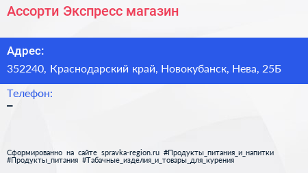 Ассорти-Экспресс, магазин по адресу 352240, Краснодарский край, Новокубанск, Нева, 25Б в дальнейшем Организация, размещена в следующих категориях: