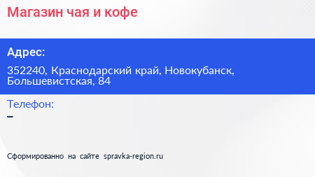 Магазин чая и кофе по адресу 352240, Краснодарский край, Новокубанск, Большевистская, 84 в дальнейшем Организация, размещена в следующих категориях:
