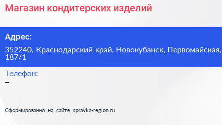 Магазин кондитерских изделий по адресу 352240, Краснодарский край, Новокубанск, Первомайская, 187/1 в дальнейшем Организация, размещена в следующих категориях: