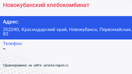 Новокубанский хлебокомбинат по адресу 352240, Краснодарский край, Новокубанск, Первомайская, 83 в дальнейшем Организация, размещена в следующих категориях:
