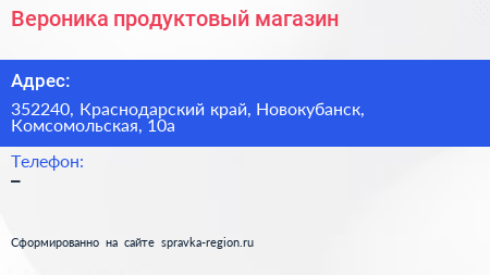 Вероника, продуктовый магазин по адресу 352240, Краснодарский край, Новокубанск, Комсомольская, 10а в дальнейшем Организация, размещена в следующих категориях: