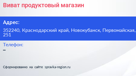Виват, продуктовый магазин по адресу 352240, Краснодарский край, Новокубанск, Первомайская, 251 в дальнейшем Организация, размещена в следующих категориях: