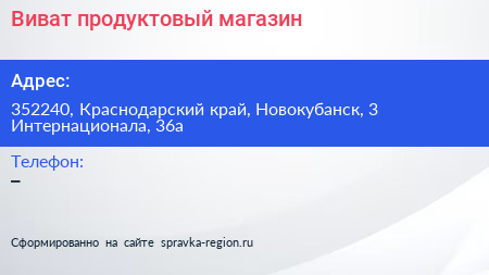 Виват, продуктовый магазин по адресу 352240, Краснодарский край, Новокубанск, 3 Интернационала, 36а в дальнейшем Организация, размещена в следующих категориях: