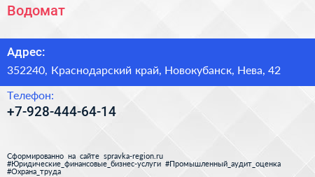Водомат по адресу 352240, Краснодарский край, Новокубанск, Нева, 42 в дальнейшем Организация, размещена в следующих категориях: