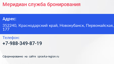 Меридиан, служба бронирования по адресу 352240, Краснодарский край, Новокубанск, Первомайская, 177 в дальнейшем Организация, размещена в следующих категориях: