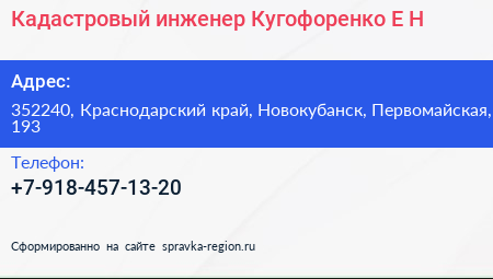 Кадастровый инженер Кугофоренко Е.Н. по адресу 352240, Краснодарский край, Новокубанск, Первомайская, 193 в дальнейшем Организация, размещена в следующих категориях: