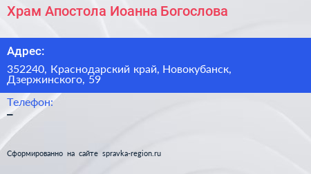 Храм Апостола Иоанна Богослова по адресу 352240, Краснодарский край, Новокубанск, Дзержинского, 59 в дальнейшем Организация, размещена в следующих категориях: