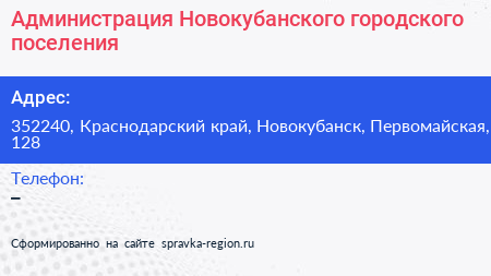 Администрация Новокубанского городского поселения по адресу 352240, Краснодарский край, Новокубанск, Первомайская, 128 в дальнейшем Организация, размещена в следующих категориях: