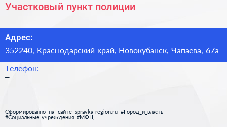Участковый пункт полиции по адресу 352240, Краснодарский край, Новокубанск, Чапаева, 67а в дальнейшем Организация, размещена в следующих категориях: