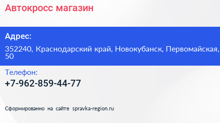 Автокросс, магазин по адресу 352240, Краснодарский край, Новокубанск, Первомайская, 50 в дальнейшем Организация, размещена в следующих категориях:
