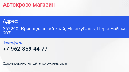 Автокросс, магазин по адресу 352240, Краснодарский край, Новокубанск, Первомайская, 207 в дальнейшем Организация, размещена в следующих категориях: