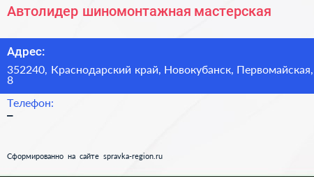 Автолидер, шиномонтажная мастерская по адресу 352240, Краснодарский край, Новокубанск, Первомайская, 8 в дальнейшем Организация, размещена в следующих категориях: