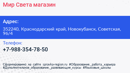 Мир Света, магазин по адресу 352240, Краснодарский край, Новокубанск, Советская, 96/4 в дальнейшем Организация, размещена в следующих категориях: