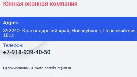 Южная оконная компания по адресу 352240, Краснодарский край, Новокубанск, Первомайская, 181а в дальнейшем Организация, размещена в следующих категориях: