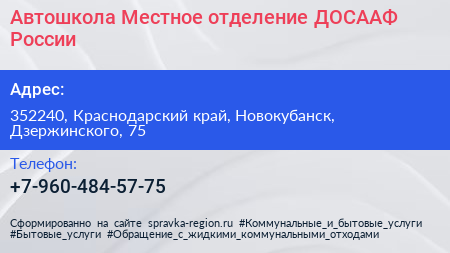 Автошкола, Местное отделение ДОСААФ России по адресу 352240, Краснодарский край, Новокубанск, Дзержинского, 75 в дальнейшем Организация, размещена в следующих категориях: