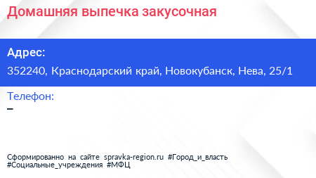Домашняя выпечка, закусочная по адресу 352240, Краснодарский край, Новокубанск, Нева, 25/1 в дальнейшем Организация, размещена в следующих категориях: