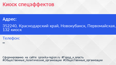 Киоск спецэффектов по адресу 352240, Краснодарский край, Новокубанск, Первомайская, 132 киоск в дальнейшем Организация, размещена в следующих категориях: