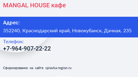MANGAL HOUSE, кафе по адресу 352240, Краснодарский край, Новокубанск, Дачная, 235 в дальнейшем Организация, размещена в следующих категориях: