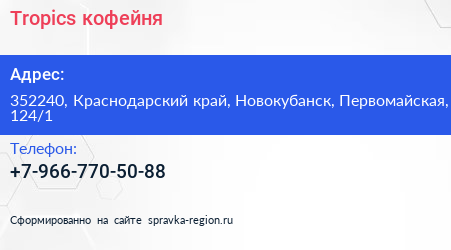 Tropics, кофейня по адресу 352240, Краснодарский край, Новокубанск, Первомайская, 124/1 в дальнейшем Организация, размещена в следующих категориях: