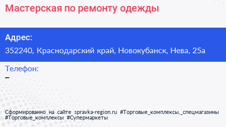 Мастерская по ремонту одежды по адресу 352240, Краснодарский край, Новокубанск, Нева, 25а в дальнейшем Организация, размещена в следующих категориях: