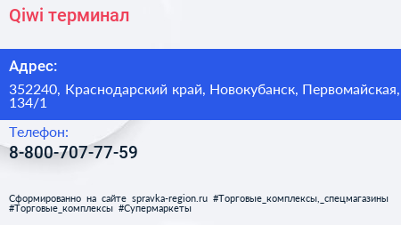 Qiwi, терминал по адресу 352240, Краснодарский край, Новокубанск, Первомайская, 134/1 в дальнейшем Организация, размещена в следующих категориях: