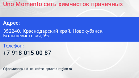 Uno Momento, сеть химчисток-прачечных по адресу 352240, Краснодарский край, Новокубанск, Большевистская, 95 в дальнейшем Организация, размещена в следующих категориях:
