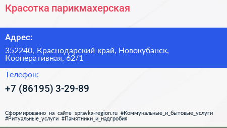 Красотка, парикмахерская по адресу 352240, Краснодарский край, Новокубанск, Кооперативная, 62/1 в дальнейшем Организация, размещена в следующих категориях: