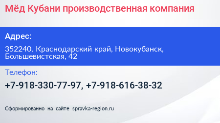 Мёд Кубани, производственная компания по адресу 352240, Краснодарский край, Новокубанск, Большевистская, 42 в дальнейшем Организация, размещена в следующих категориях: