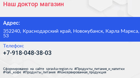 Наш доктор, магазин по адресу 352240, Краснодарский край, Новокубанск, Карла Маркса, 53 в дальнейшем Организация, размещена в следующих категориях: