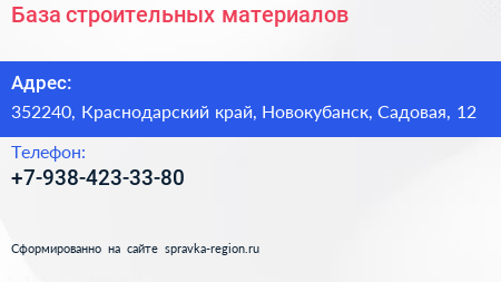 База строительных материалов по адресу 352240, Краснодарский край, Новокубанск, Садовая, 12 в дальнейшем Организация, размещена в следующих категориях:
