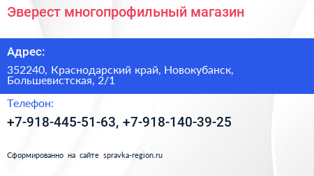 Эверест, многопрофильный магазин по адресу 352240, Краснодарский край, Новокубанск, Большевистская, 2/1 в дальнейшем Организация, размещена в следующих категориях: