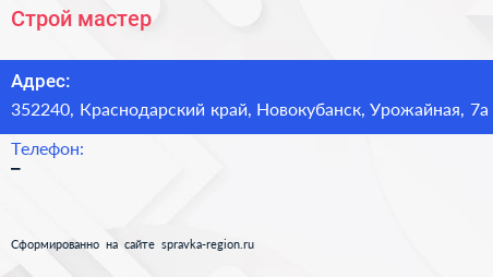 Строй мастер по адресу 352240, Краснодарский край, Новокубанск, Урожайная, 7а в дальнейшем Организация, размещена в следующих категориях: