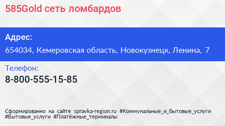 585Gold, сеть ломбардов по адресу 654034, Кемеровская область, Новокузнецк, Ленина, 7 в дальнейшем Организация, размещена в следующих категориях: