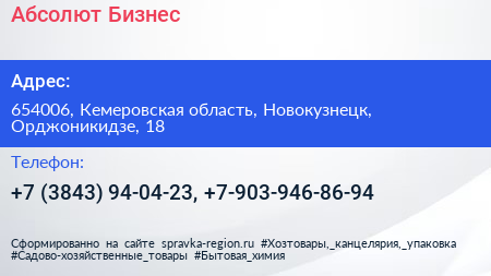 Абсолют Бизнес по адресу 654006, Кемеровская область, Новокузнецк, Орджоникидзе, 18 в дальнейшем Организация, размещена в следующих категориях: