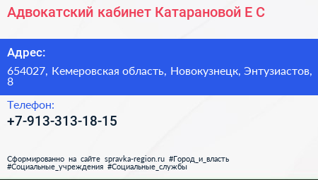 Адвокатский кабинет Катарановой Е.С. по адресу 654027, Кемеровская область, Новокузнецк, Энтузиастов, 8 в дальнейшем Организация, размещена в следующих категориях: