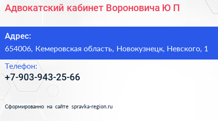Адвокатский кабинет Вороновича Ю.П. по адресу 654006, Кемеровская область, Новокузнецк, Невского, 1 в дальнейшем Организация, размещена в следующих категориях: