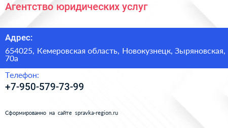 Агентство юридических услуг по адресу 654025, Кемеровская область, Новокузнецк, Зыряновская, 70а в дальнейшем Организация, размещена в следующих категориях: