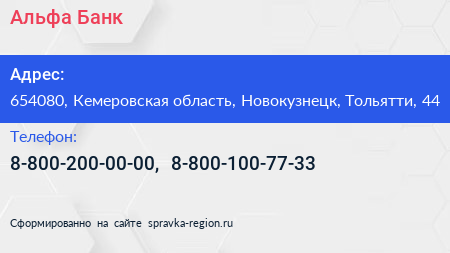 Альфа-Банк по адресу 654080, Кемеровская область, Новокузнецк, Тольятти, 44 в дальнейшем Организация, размещена в следующих категориях: