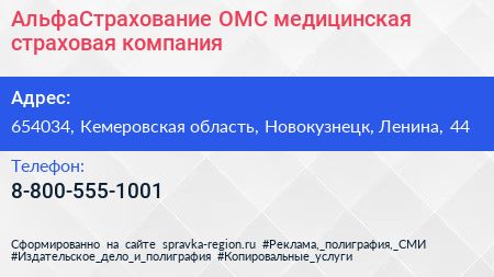 АльфаСтрахование-ОМС, медицинская страховая компания по адресу 654034, Кемеровская область, Новокузнецк, Ленина, 44 в дальнейшем Организация, размещена в следующих категориях: