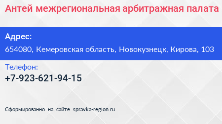 Антей, межрегиональная арбитражная палата по адресу 654080, Кемеровская область, Новокузнецк, Кирова, 103 в дальнейшем Организация, размещена в следующих категориях: