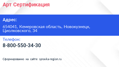 Арт-Сертификация по адресу 654041, Кемеровская область, Новокузнецк, Циолковского, 34 в дальнейшем Организация, размещена в следующих категориях: